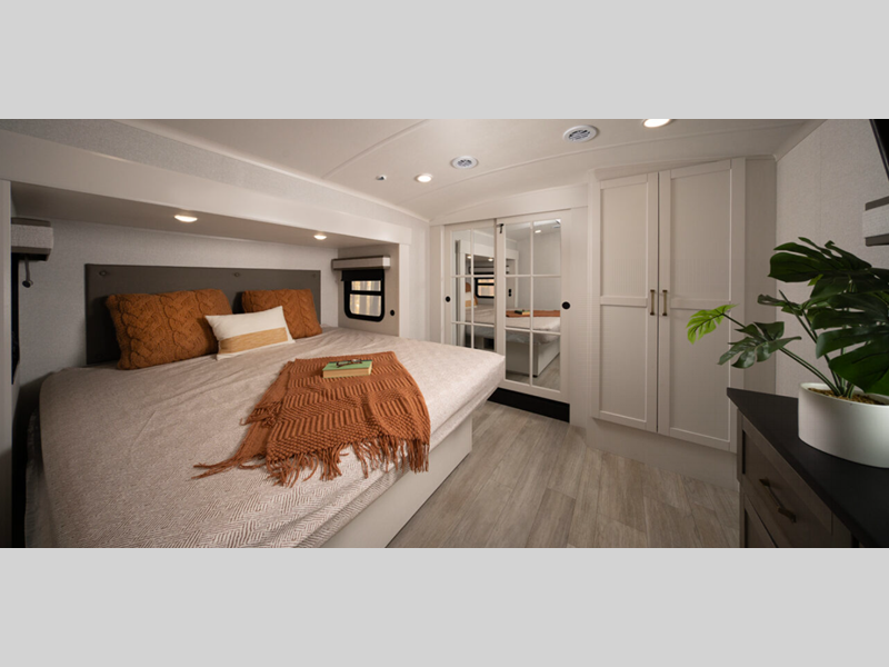 - Core Shield aluminum-framed and vacuum – Bonded laminated gel-coated fiberglass exteriors walls and slideout/end walls