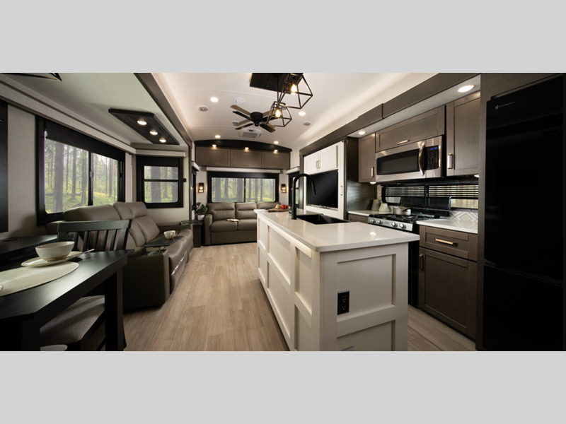 Sleeps 4 Slides 3 Length 36 ft 1 in Ext Width 8 ft 6 in Ext Height 12 ft 7 in Int Height 8 ft 6 in Hitch Weight 2350 lbs GVWR 14800 lbs Dry Weight 21575 lbs Cargo Capacity 2225 lbs Fresh Water Capacity 75 gals Grey Water Capacity 87 gals Black Water Capacity 50 gals Tire Size ST235/80R16'H' Furnace BTU 35000 btu Available Beds King Refrigerator Type 12V Refrigerator Size 16 cu ft Convection Cooking Yes Shower Size 30" x 48" Number of Awnings 2 LP Tank Capacity 30 lbs Water Heater Type Tankless AC BTU 30000 btu TV Info LR LED HDTV Awning Info 10' and 16' Electric Patio Awning Axle Count 2 Number of LP Tanks 2 Shower Type Standard Solar Wattage 200 watts Similar Floorplans