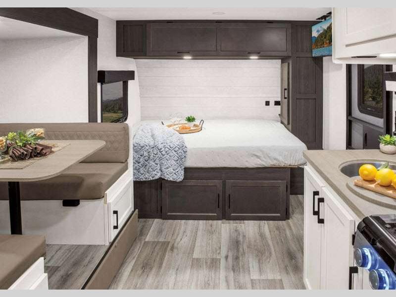 Sleeps 3 Length 23 ft 3 in Ext Width 7 ft 6 in Ext Height 10 ft 5 in Int Height 6 ft 6 in Interior Color Chestnut, Fawn Hitch Weight 420 lbs GVWR 5800 lbs Dry Weight 4090 lbs Cargo Capacity 1710 lbs Fresh Water Capacity 36 gals Grey Water Capacity 30 gals Black Water Capacity 30 gals Tire Size 15" Furnace BTU 20000 btu Available Beds RV Queen Refrigerator Type 12V Refrigerator Size 8 cu ft Cooktop Burners 3 Shower Size 30" x 36" Number of Awnings 1 Axle Weight 3690 lbs LP Tank Capacity 20 lbs. Water Heater Type Tankless Awning Info 14' Axle Count 2 Number of LP Tanks 2 Shower Type Standard Solar Wattage 200 watts Similar Floorplans