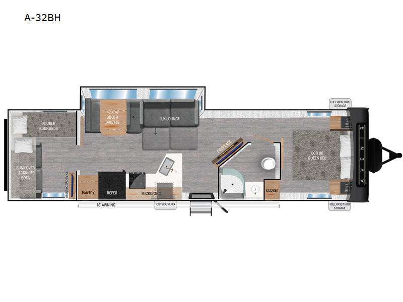 The largest of the Avenir line offers sleeping for a large group with a private bunkhouse in back featuring a bunk over a jackknife sofa and a second set of bunks sleeping five total in this space. There is also a dresser for storage opposite the sofa with TV prep above it. In the main combined kitchen and living room you will enjoy added space thanks to a large slide out 42" x 76" booth dinette and Lux Lounge which can both be converted to extra sleeping space if needed. An angled interior wall from the bathroom is where you will view the fireplace. Opposite the slide is your kitchen area where you can easily create meals and snacks just like home. You will find a large pantry, refrigerator, three burner cooktop and large sink for cleaning up. There is also a microwave oven and overhead storage for all of your dishes. An outside refrigerator under the 18' awning allows you to keep drinks and cold snacks readily available when spending time outside. A full bath with radius shower will keep everyone feeling clean and fresh, and the private front bedroom offers a queen bed, dual nightstands and storage with a full pass-through on the outside beneath the head of the bed for all of your outdoor gear.