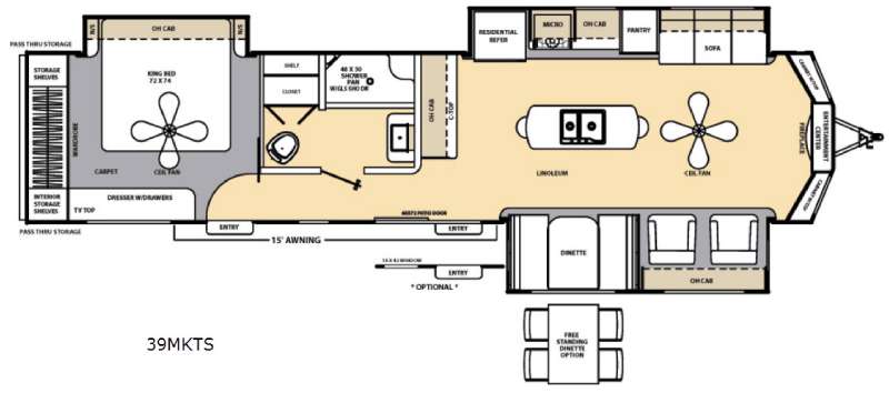In the very front you will enjoy plenty of space to just sit back and relax. There is a front wall entertainment center that includes a fireplace below where you could put a flat screen TV. On either side enjoy storage in the cabinet bases with counter-tops above.