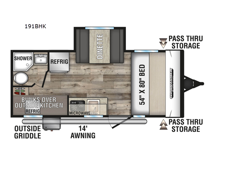 You're going to love camping in this spacious travel trailer that can sleep five people each night. When you arrive at your destination, set up the 14' power awning and start lunch on the outside kitchen. The little ones will love the bunk beds, and you will have the front RV queen bed all to yourselves. This model also includes a full bath that will allow you to stay clean, and there is a wardrobe by the bunks to keep your clothes wrinkle-free.